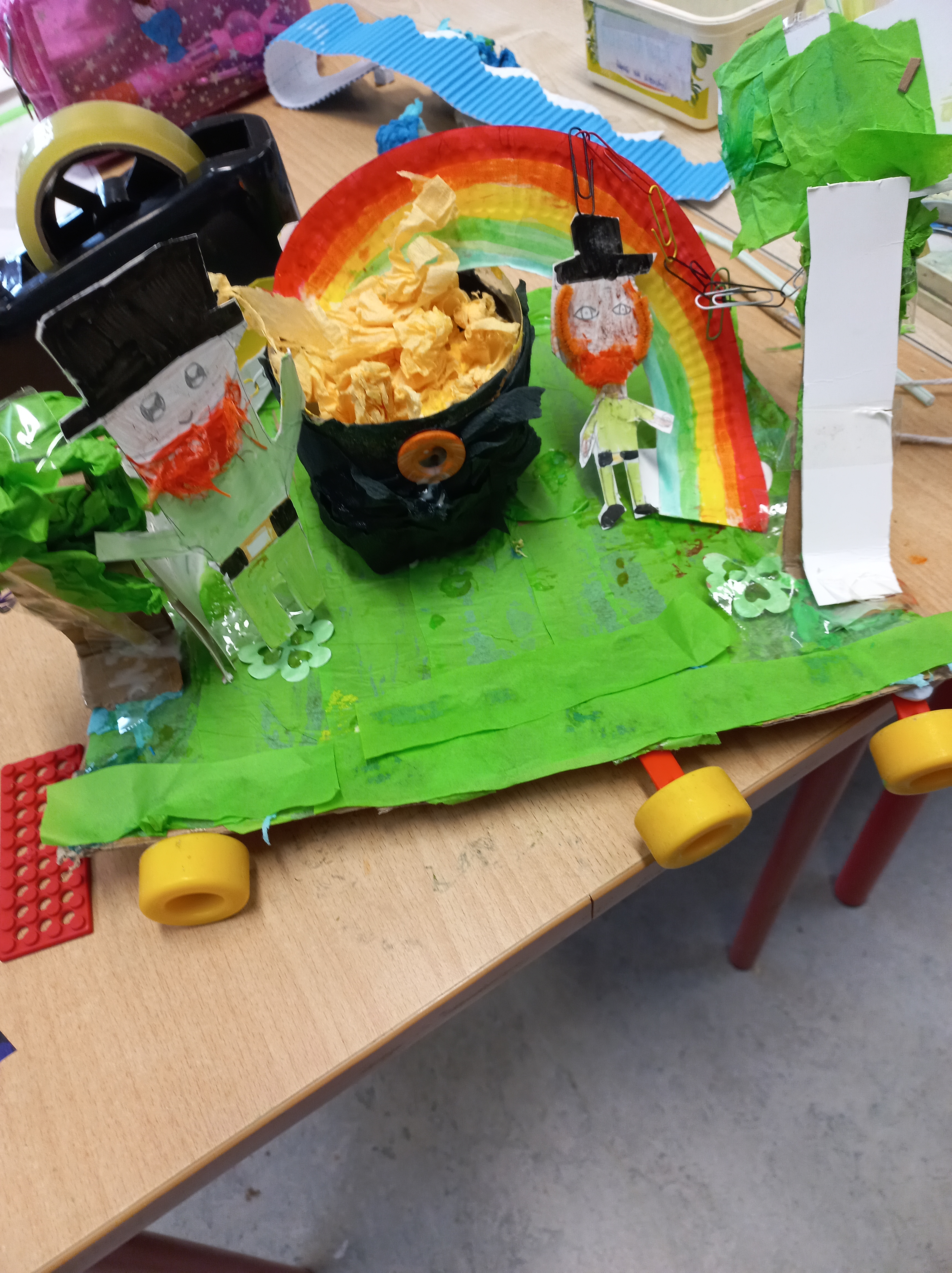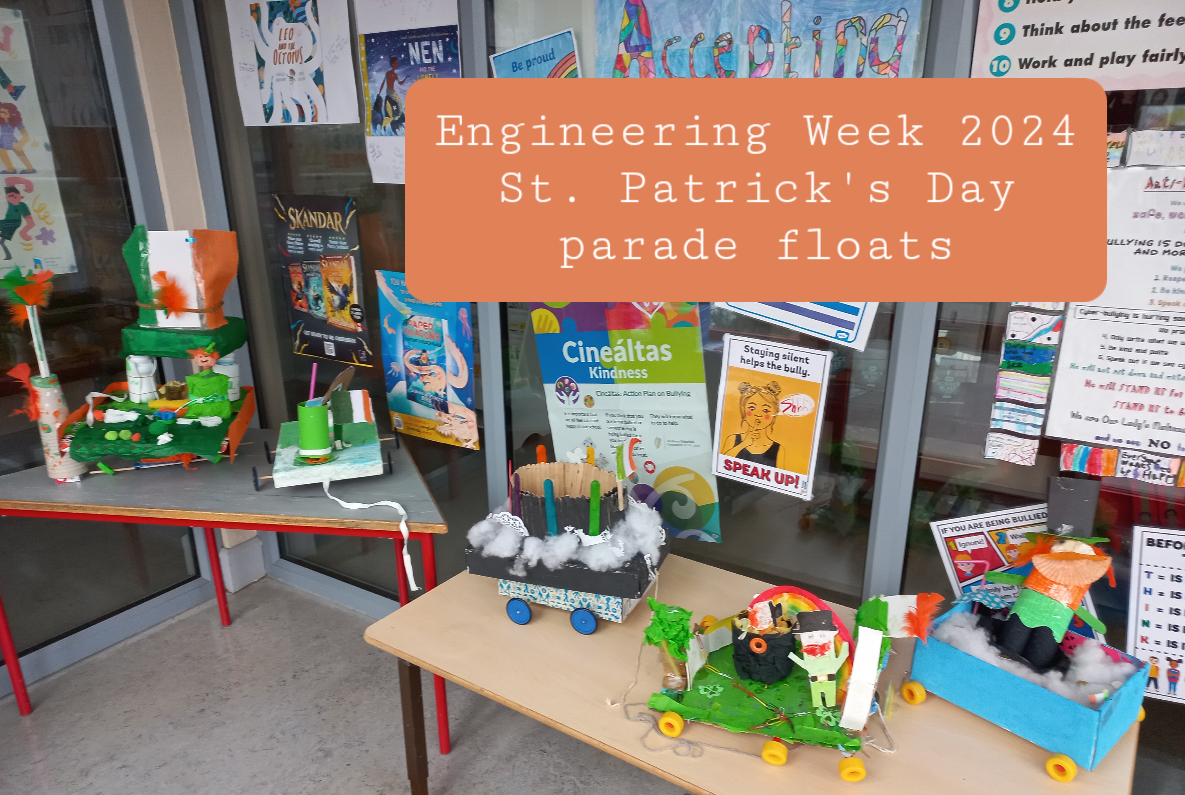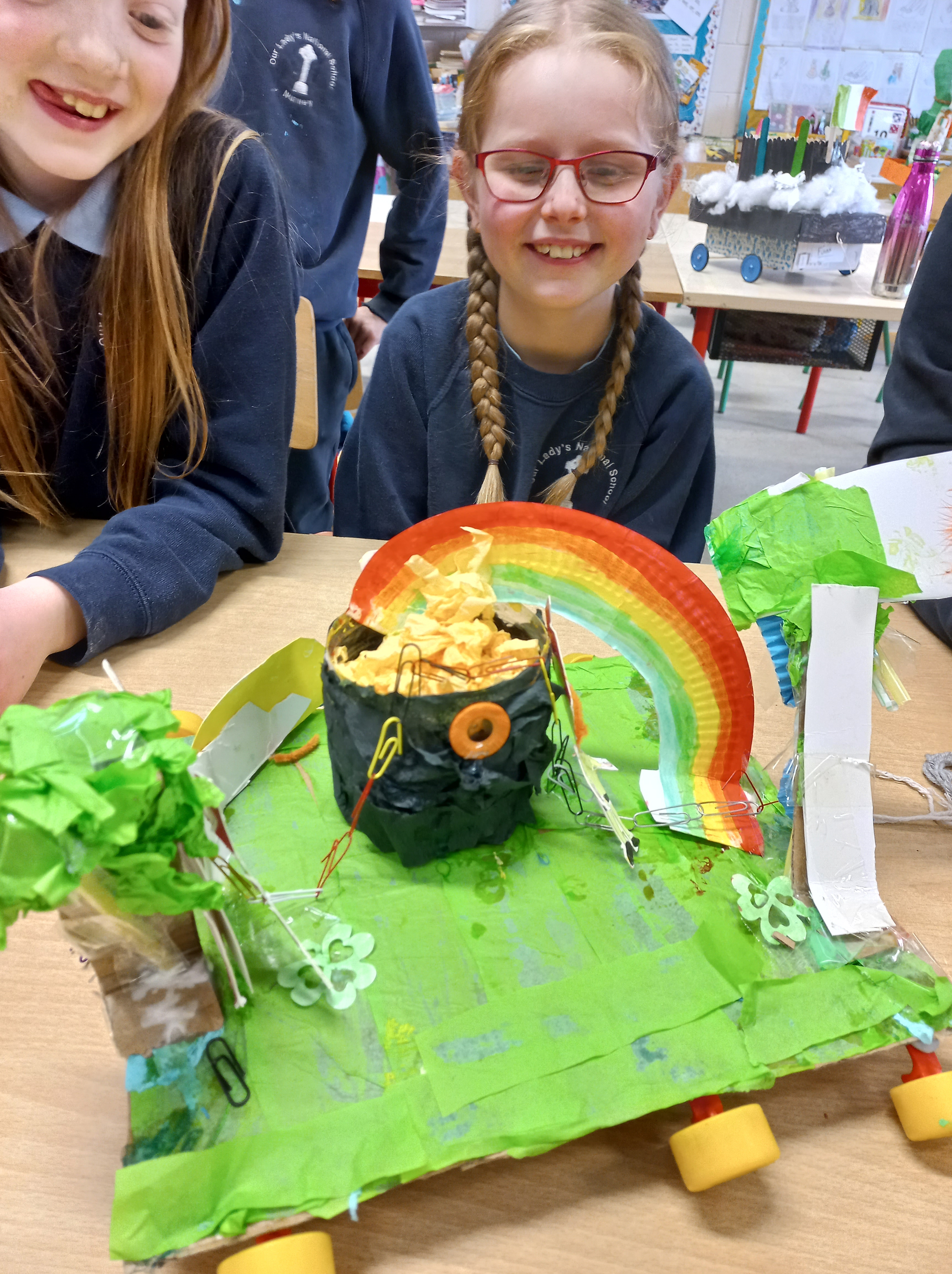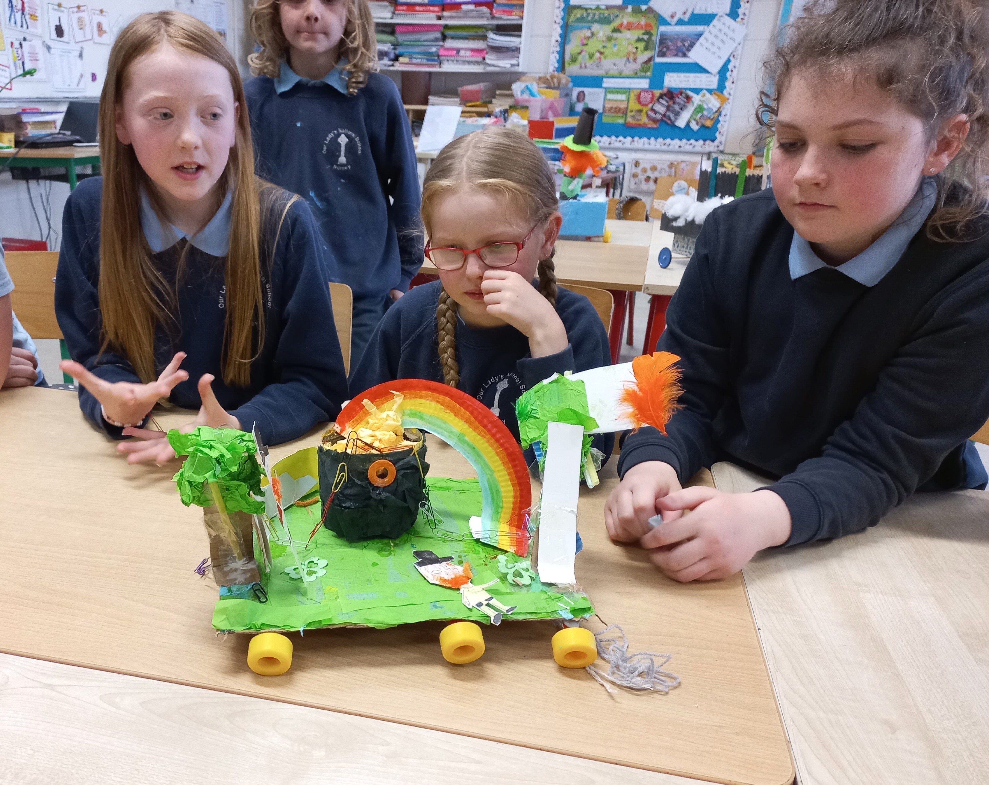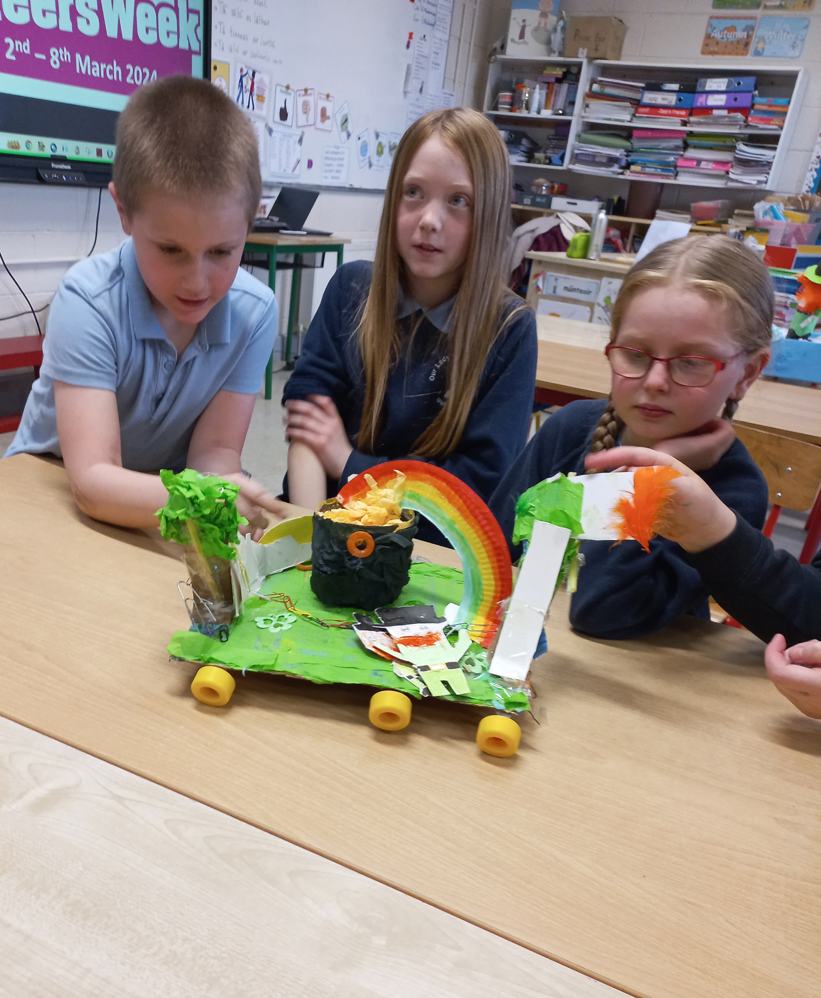 As part of our STEM work, the whole-school joined together for our annual Engineering Week event. The children worked in groups to create a working (moving), mini-float for St. Patrick’s Day. The brainstormed ideas, planned, designed, created, modified and collaborated on their project. They presented their work and spoke about problems they encountered and how they overcame those difficulties. The results were fantastic and we were delighted to see such great teamwork.