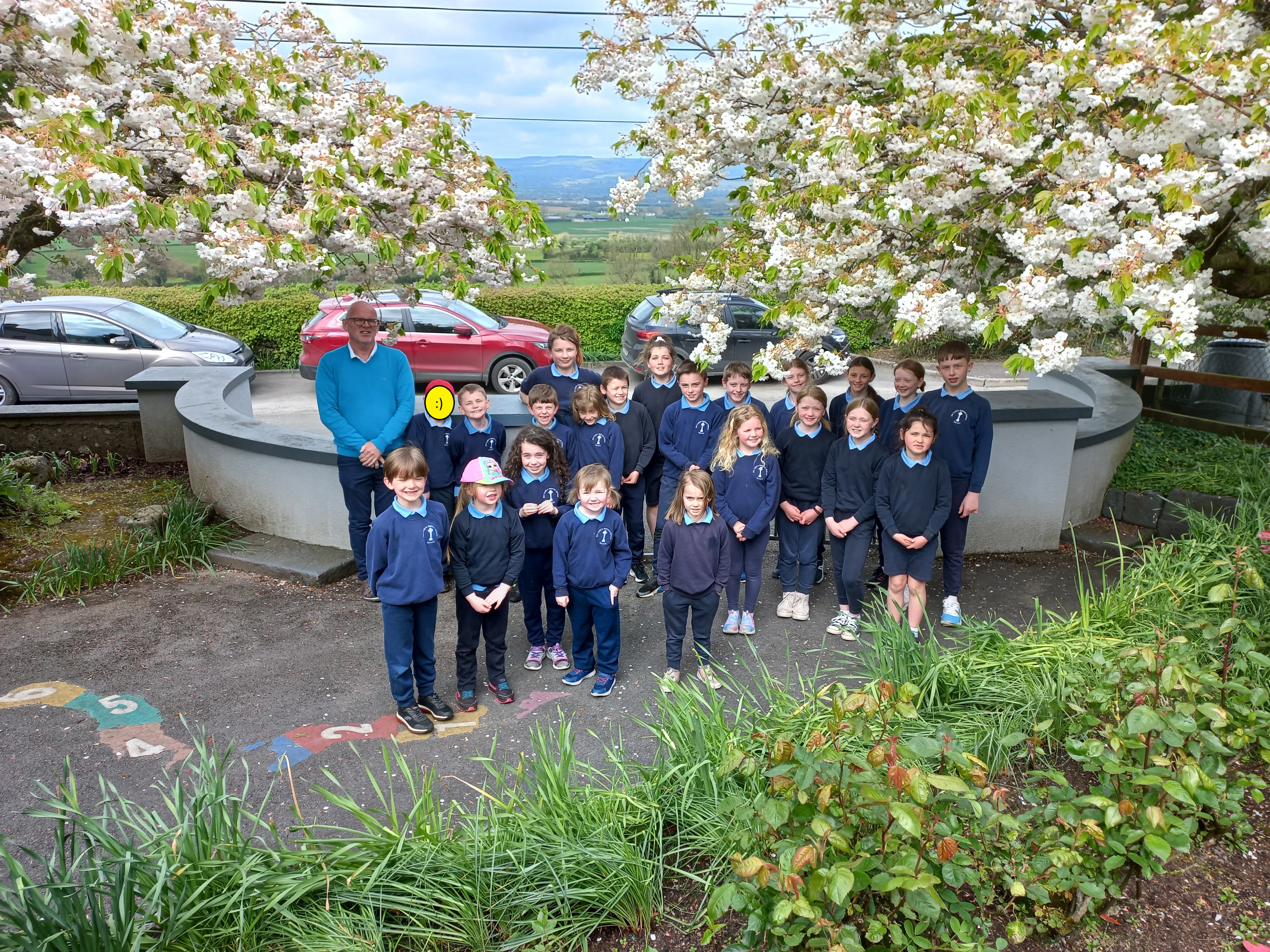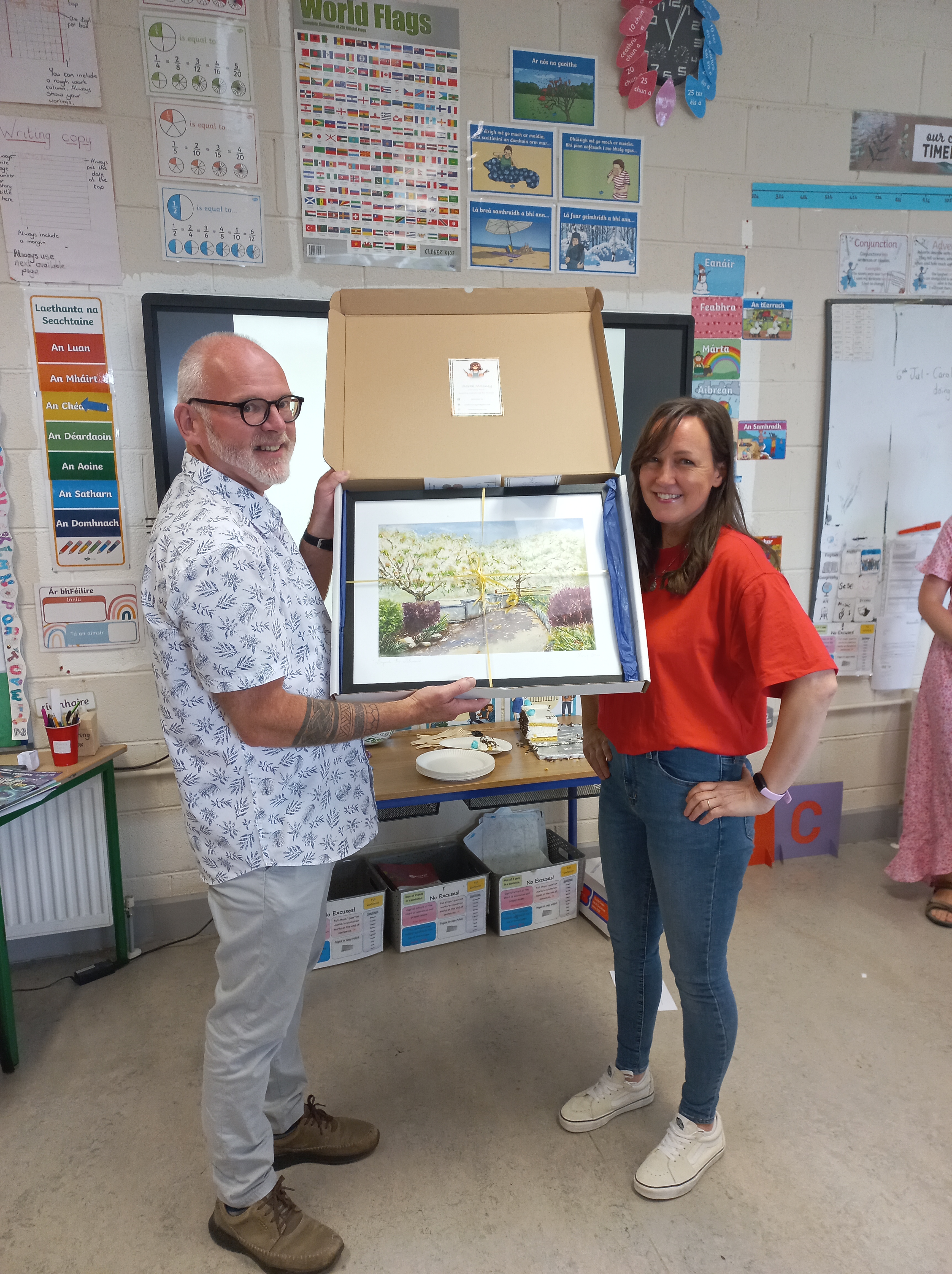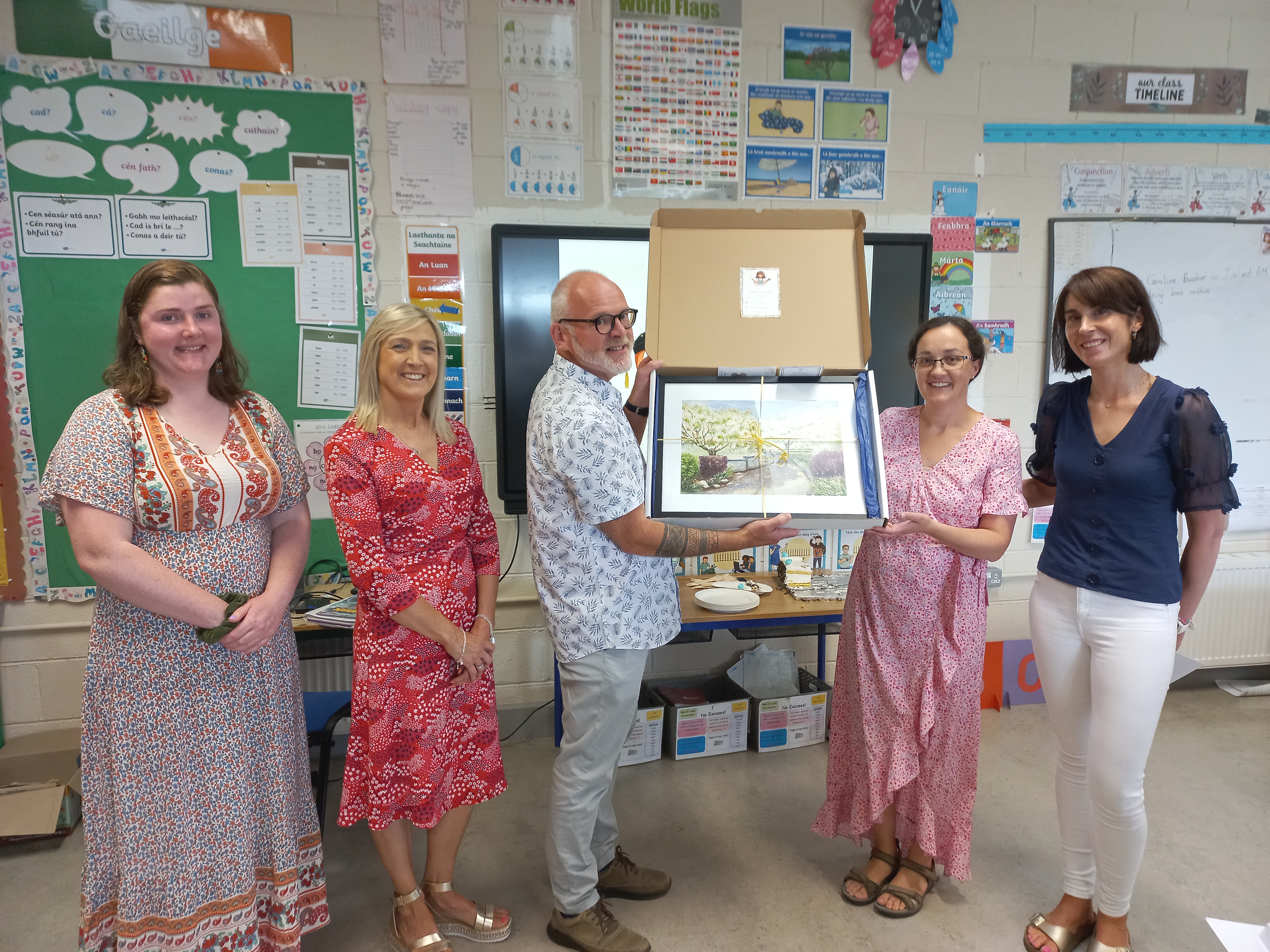 The children marked our principal, Martin Duffy’s, retirement at the end of June with a day packed with a hot-chocolate and chats coffee morning, memory sharing, art-work and messages presented by the children, tree-planting, singing and dancing, and presentation from the staff of artwork by artist, Sarah Moloney. The Parents Association and Board of Management held a retirement function at the end of the summer. We thank Mr. Duffy for his hard work and commitment to the school and wider community, and wish him well on his retirement.