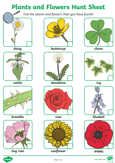 Go on a nature trail – You can print off page one in colour or black and white, clicking the link below, or use the template on Seesaw. Mark the plants and flowers you find on your nature hunt sheet. Count them and record the number beside its picture/name. Which plant was the most common? You can upload your finished sheet to Seesaw to show me.
